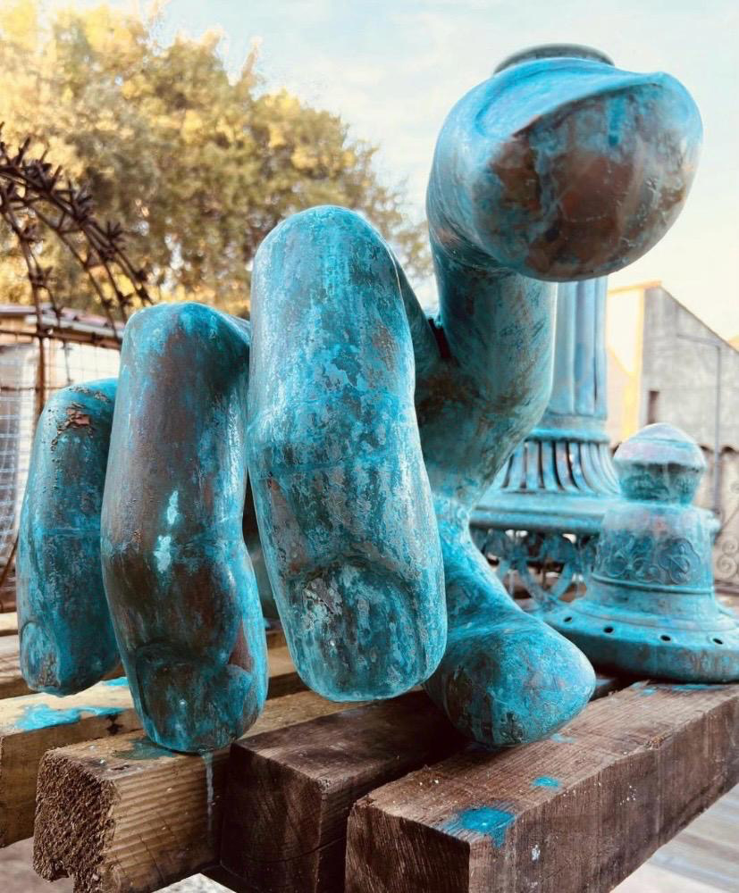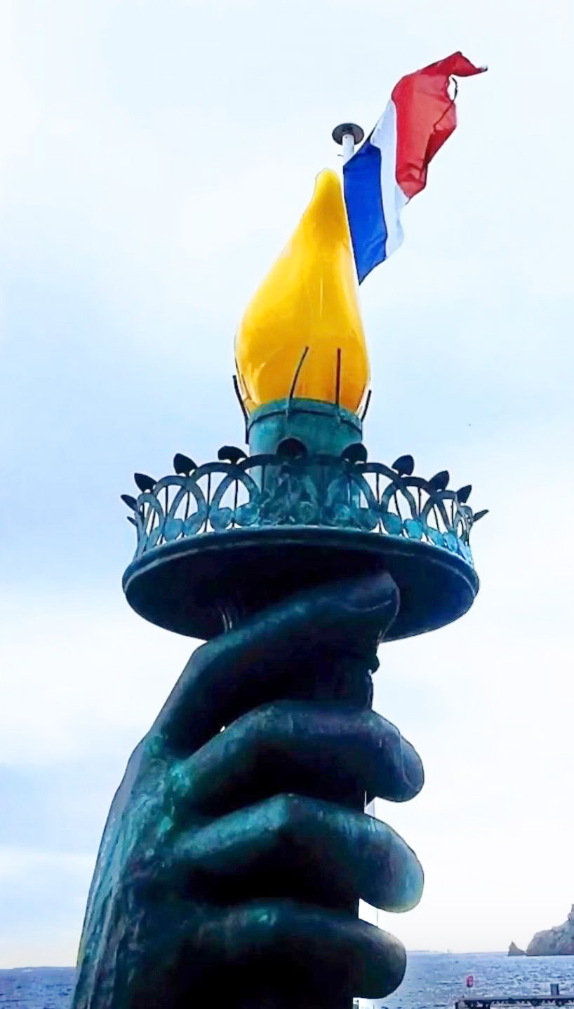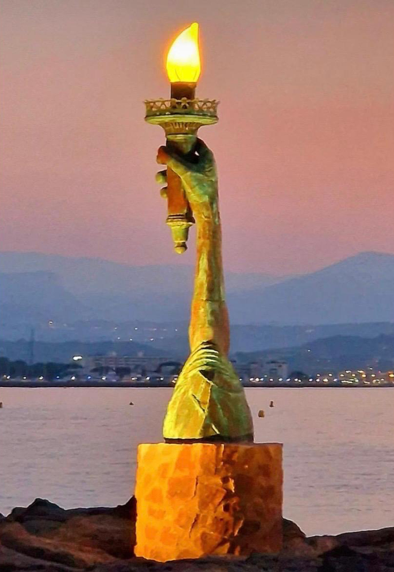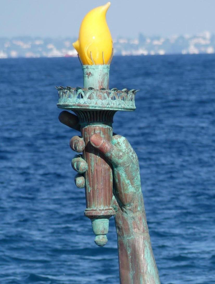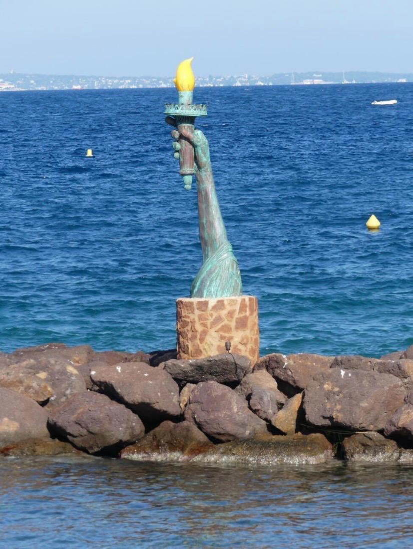 Avec vue sur les iles de Lerins et la pointe de l’Aiguille. Cette sculpture est entièrement réalisée en cuivre soudé pour résister aux embruns marins. comme l’originale de New York elle est colorée d’un vert de gris authentique.